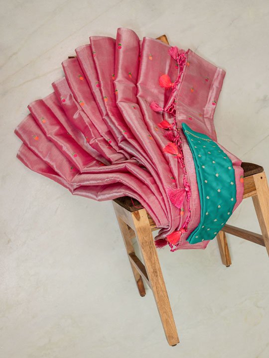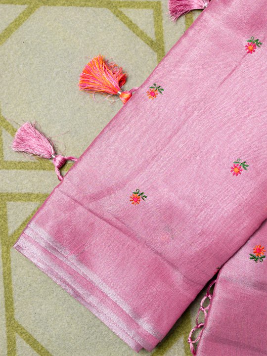 An elegant blush pink linen saree adorned with delicate floral buti embroidery and finished with charming tassels with Contrast blouse.