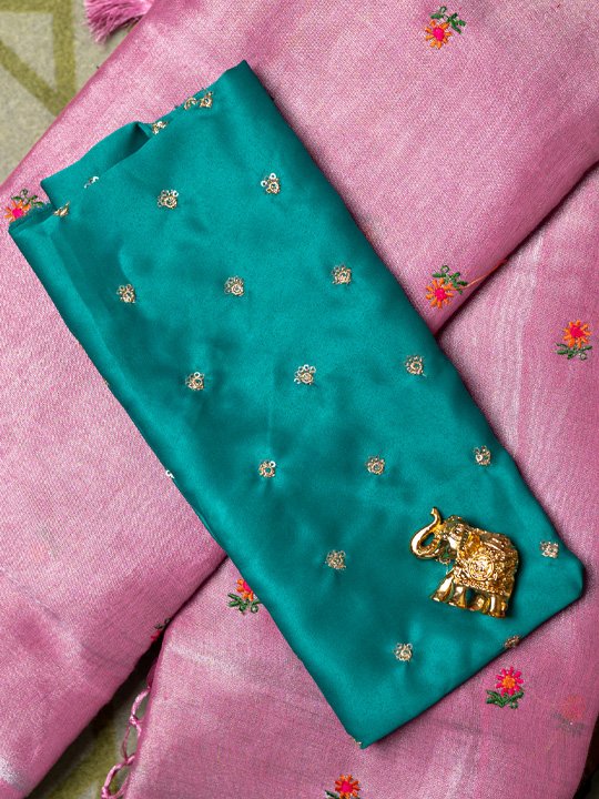 Linen Saree with Floral Buti Embroidery and Tassel Pallu with Contrast Blouse