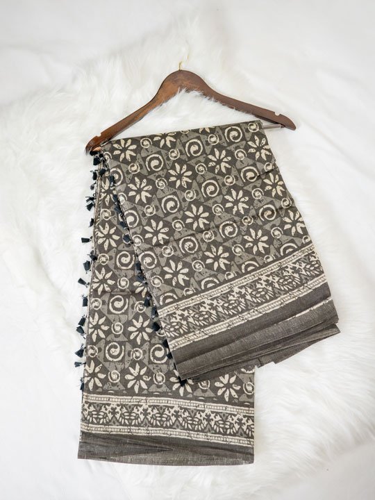 Elegant grey cotton saree featuring traditional hand block-inspired floral and spiral motifs with a contrasting border and tassel pallu. Lightweight, breathable, and perfect for everyday ethnic wear.
