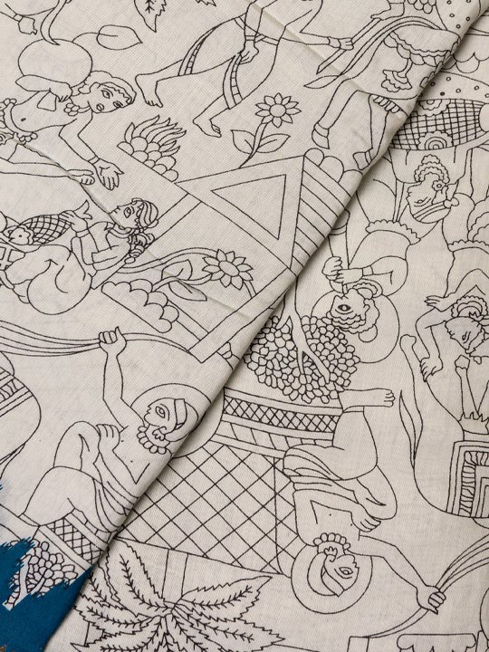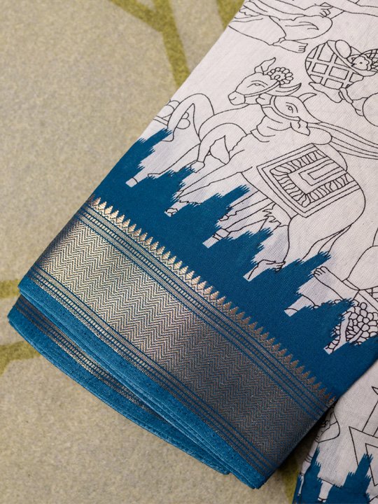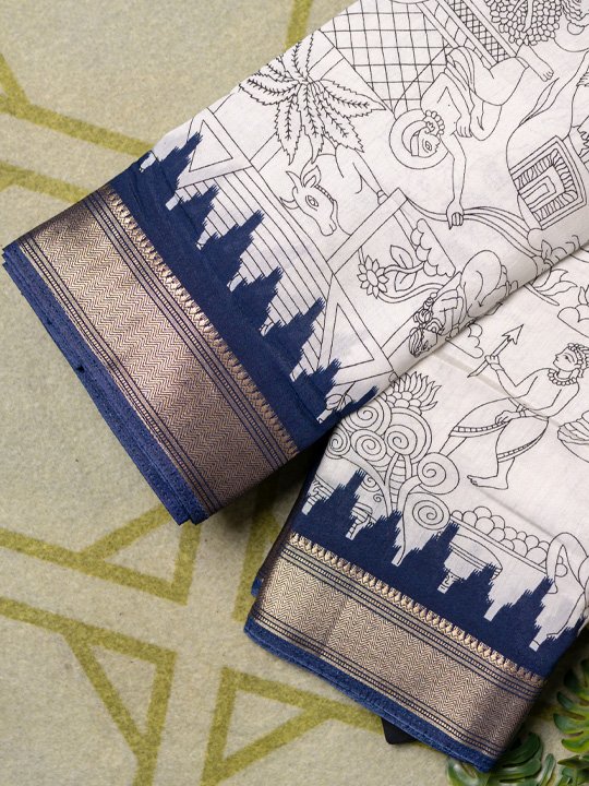 An elegant ivory cotton saree featuring intricate hand-illustrated traditional motifs, paired with a rich indigo and Zari-inspired woven border for a timeless ethnic look.