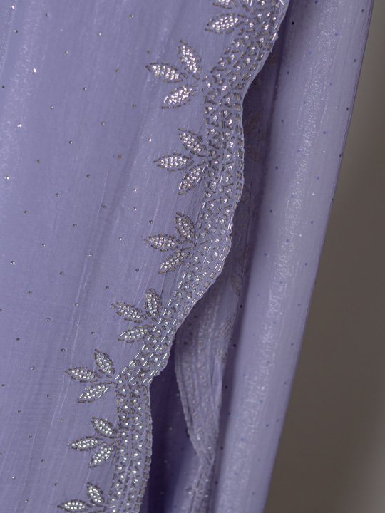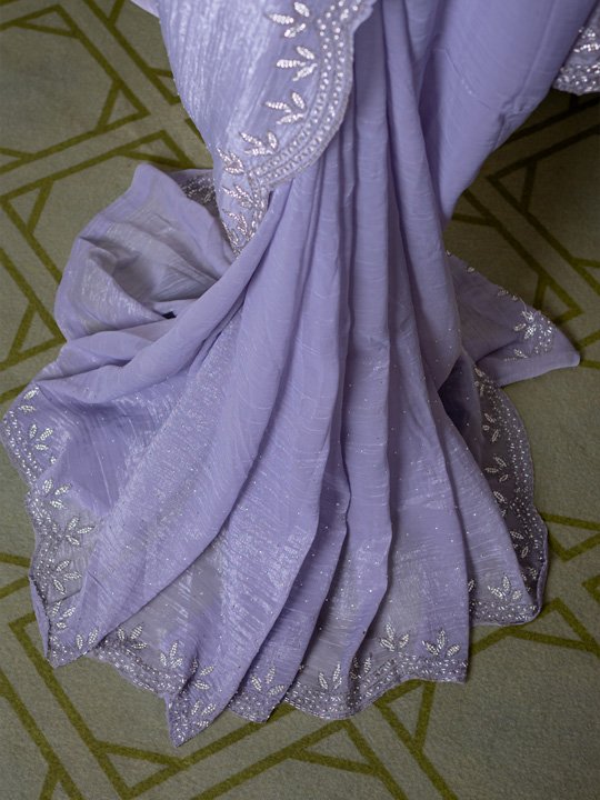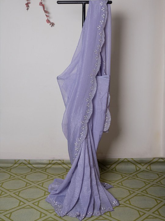 An elegant lavender saree featuring a soft, flowy drape with a beautifully scalloped ruffle border accented by delicate sequin hand work.