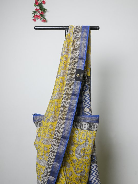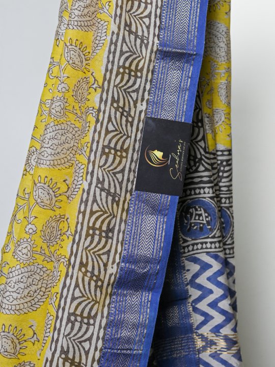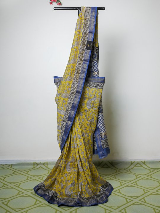 A graceful mustard yellow Maheshwari silk saree adorned with intricate traditional motifs and a striking royal blue border, offering a perfect blend of heritage elegance and contemporary charm.