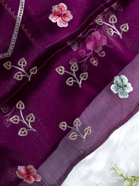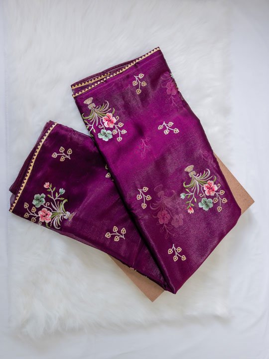 Wine Purple Saree with Pastel Floral Embroidery – Paper tissue
