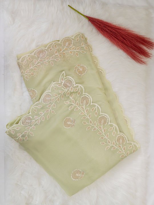 A graceful pastel green organza saree adorned with delicate floral embroidery and an elegant, scalloped border, perfect for festive and elegant occasions.
