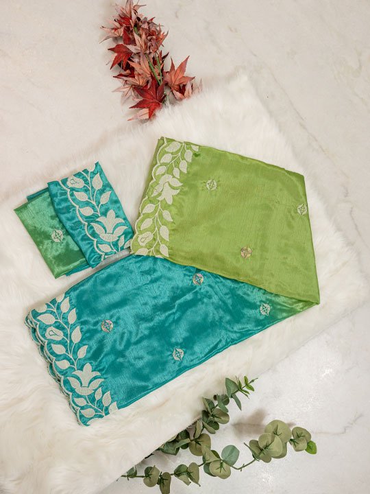 The fabric has a smooth, glossy sheen typical of silk, the contrast colors (green and teal) with woven/embroidered border motifs.
