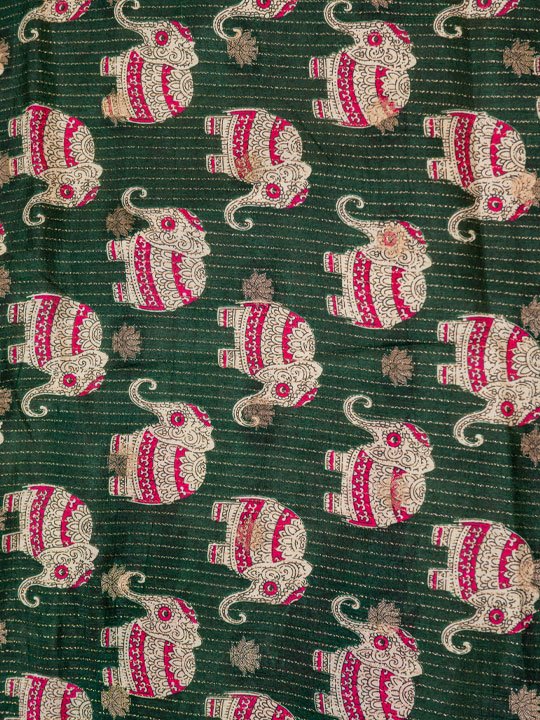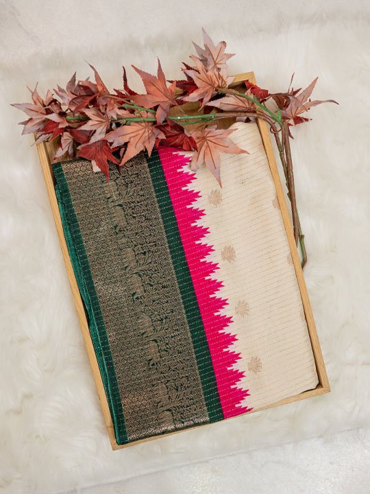 A soft off-white/cream body with subtle woven motifs, giving it an elegant and refined look. The highlight is its rich contrast border, which combines deep green and antique gold woven patterns, enhanced with traditional floral and geometric detailing. A bold pink zigzag (temple-style) border adds a striking pop of color, creating a beautiful balance between classic and contemporary design.